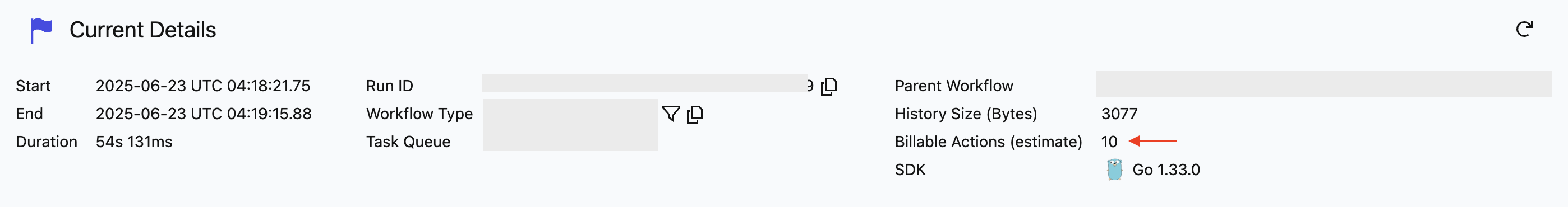 When viewing a Workflow history, events that represent a Billable Action are annotated with the number consumed by the event in the Billable Actions Column. These Actions are summarized at the top of the workflow.